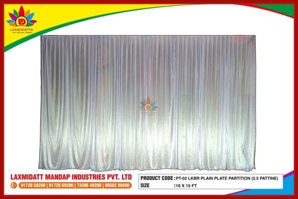 Add a touch of elegance to your event with this PT-02 LKBR Plain Plate Partition featuring a 2.5 Pattine pleated satin design. Ideal for wedding stages, photo booths, and ceremonial backdrops, this lightweight and easy-to-install partition offers a clean and classy appearance.