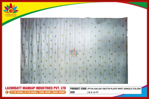 Add elegance to your event décor with our PT-04 Galaxy Butta Plate Part. Crafted with fine fabric and delicate golden embroidery, this 10 x 15 ft single-color backdrop is perfect for weddings, receptions, and stage decorations. Easy to install and reuse, it’s a must-have for professional decorators and event planners.