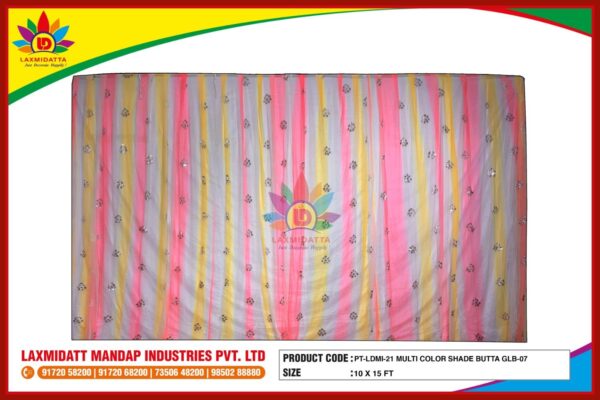 This vibrant Multi-Color Shade Butta Partition is designed with eye-catching stripes and floral butta work. Ideal for traditional and modern functions, it adds a colorful and festive look to weddings, mehendi, and cultural events.