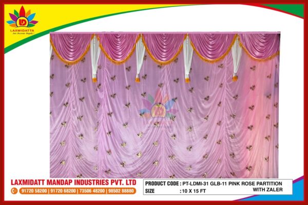 Add a touch of charm and elegance to your events with this Pink Rose Partition backdrop. Crafted from premium fabric in a soft pink tone, adorned with intricate rose motifs and highlighted by golden and white zaler draping, this setup brings a graceful look to weddings, receptions, and special occasions.