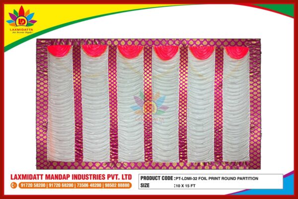 This elegant Foil Print Round Partition backdrop combines traditional charm with modern shine. Crafted with glossy white fabric and bordered in vibrant pink & golden foil print, it adds a royal touch to wedding stages, entry partitions, and ceremonial setups. Its eye-catching round pattern design is ideal for high-impact décor.