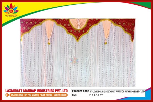 This elegant peach pleat partition is beautifully designed with rich red velvet cloth and golden lace detailing, adding a royal and luxurious touch to any wedding or stage decoration. A perfect choice to enhance the beauty of your special occasions with style and grace.