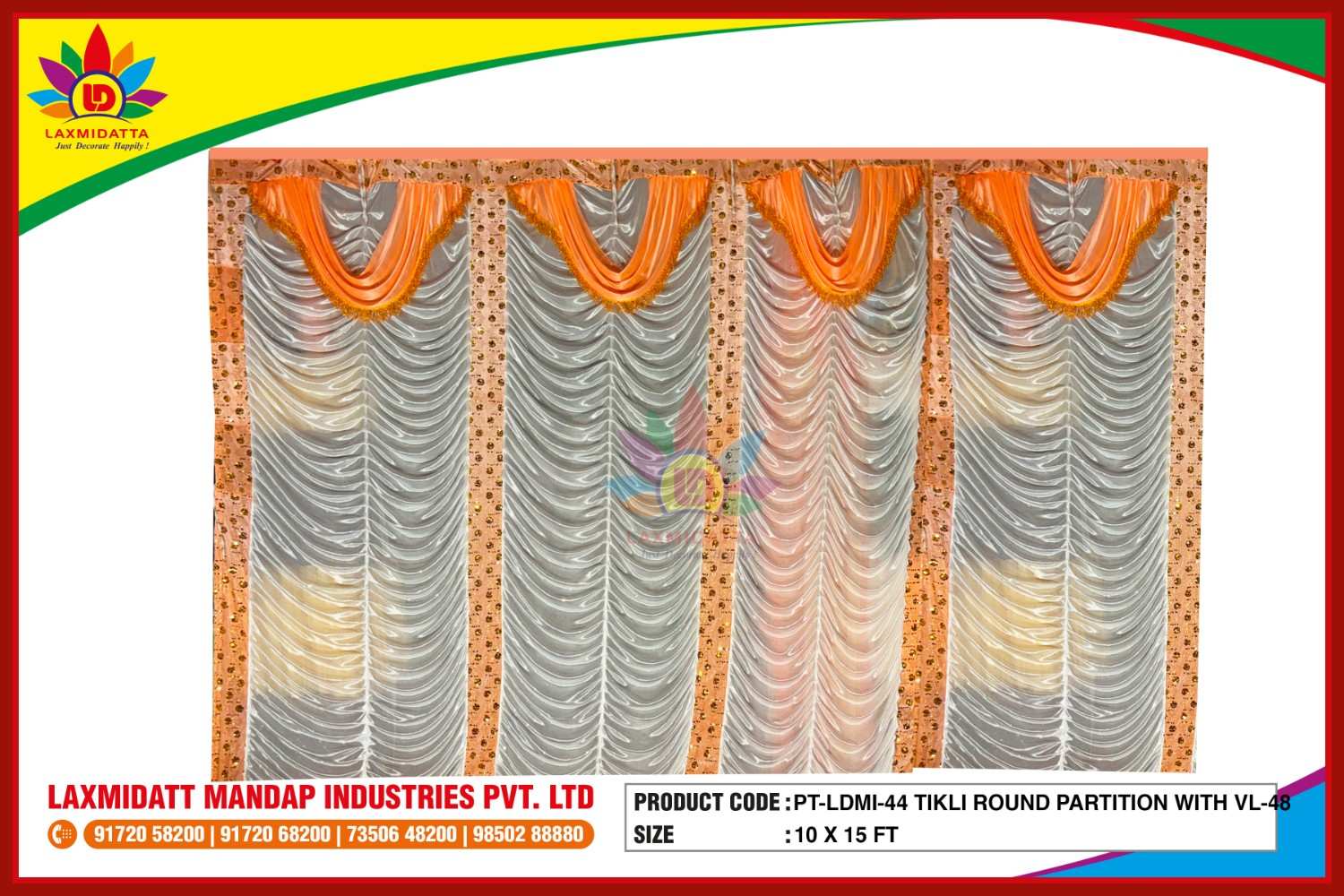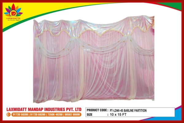 This soft and elegant Barline Partition features flowing layers of sheer pink and white fabric, highlighted with a glossy upper drape and golden trim. The graceful swag design with delicate floral accents makes it perfect for weddings, receptions, stage backgrounds, or event entrances. Lightweight, attractive, and easy to install — a perfect touch of sophistication for any celebration.
