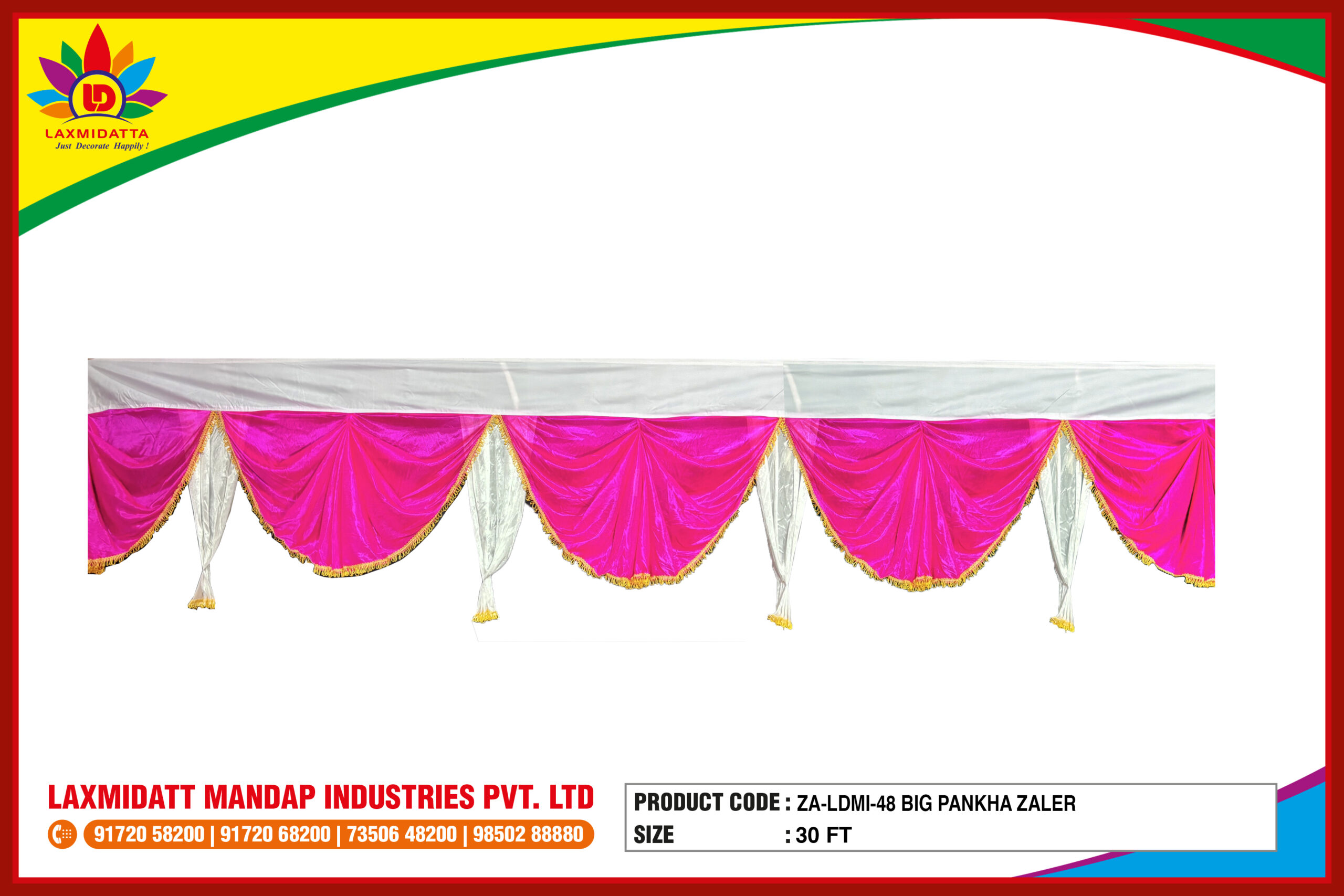 Enhance your event décor with this elegant Small Pankha Zaler. Crafted in a vibrant yellow and white combination, this 30 ft long decorative piece is perfect for mandap setups, stage decoration, entrance arches, or any traditional celebration. Made from high-quality fabric with neat pleats and shining borders, it adds a beautiful and festive touch to any setting.