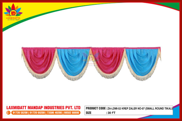 Add a vibrant and festive charm to your event with this 30 Ft Krep Zaler featuring a beautiful Small Round Tikali design in pink and blue shades. Made from soft crepe fabric with decorative shimmer and golden fringes, this zaler is ideal for weddings, receptions, and traditional functions. Lightweight, easy to hang, and reusable.